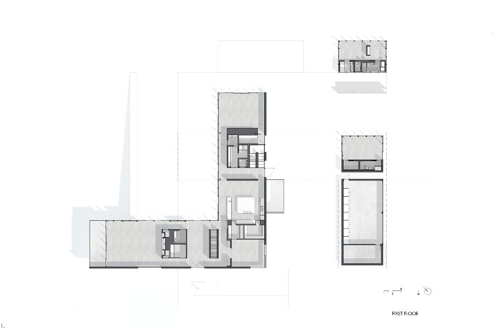 •بالهای L شکل: خانه از دو بال L شکل تشکیل شده که بهطور هماهنگ با توپوگرافی زمین طراحی شدهاند. این ساختار بدون نیاز به تغییرات گسترده در زمین، بهخوبی با محیط اطراف سازگار شده است.